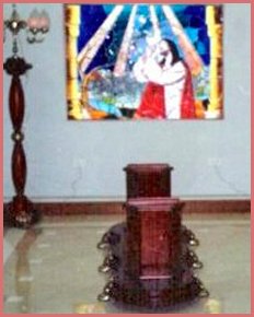 Capilla de cedro y bronce, con cristo en vitró. Apliques en bronce tipo araña. A pedido.
